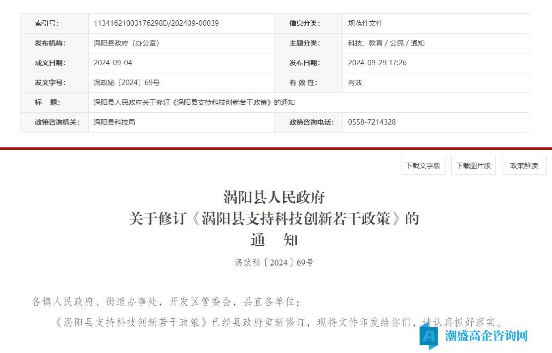 亳州市涡阳县高新技术企业奖励政策:涡阳县支持科技创新若干政策(2024年修订)