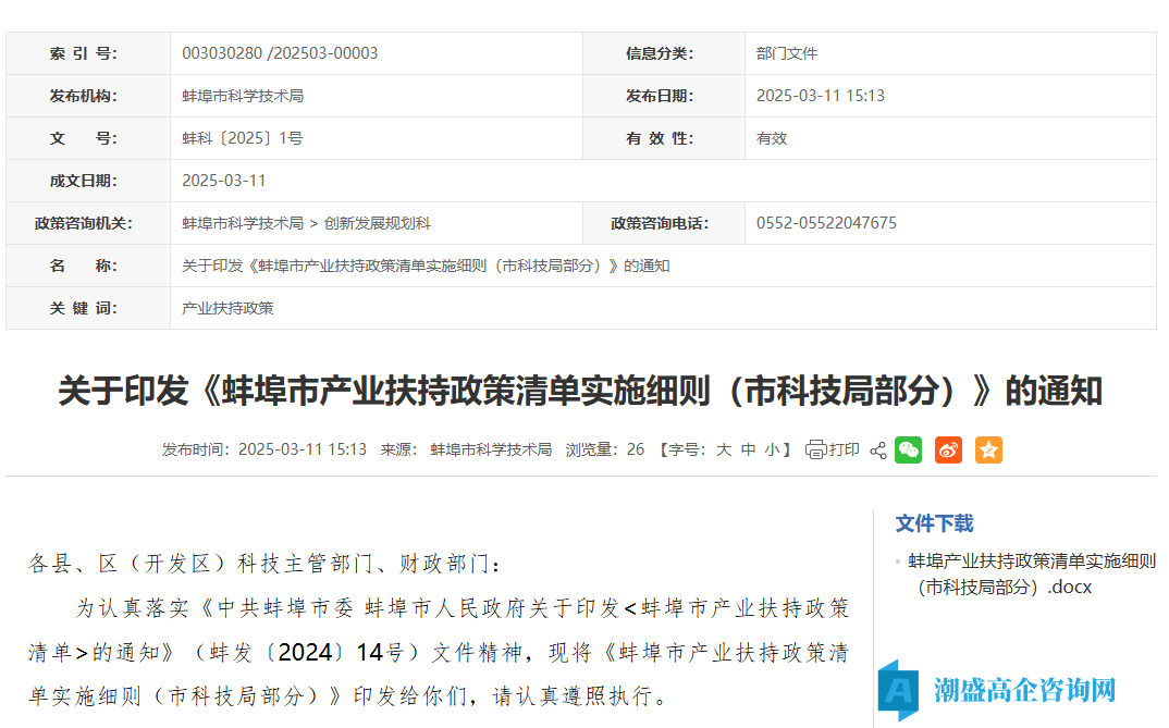 本文标题:蚌埠市高新技术企业奖励政策:蚌埠市产业扶持政策清单实施细则(市科技局部分)