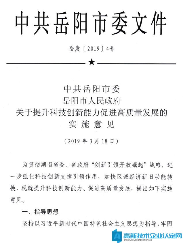 岳阳市高新技术企业奖励政策:中共岳阳市委岳阳市人民政府关于提升科技创新能力促进高质量发展的实施意见