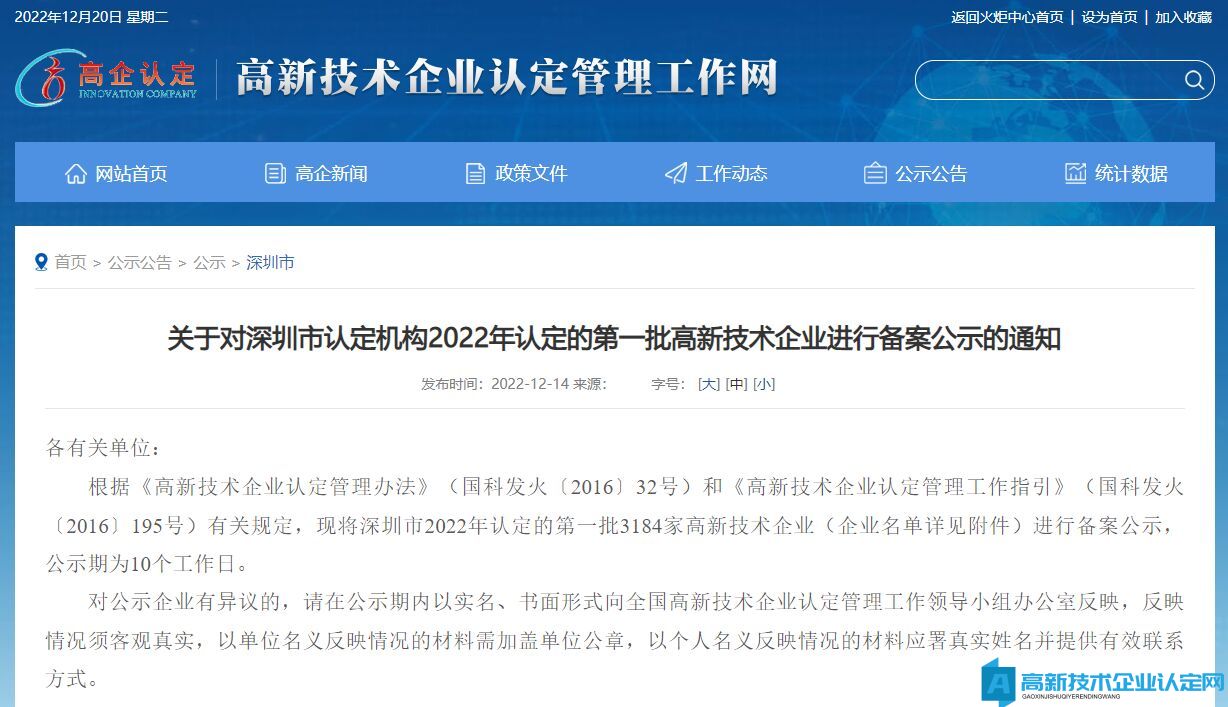 根据《高新技术企业认定管理办法》(国科发火〔2016〕32号)和《高新技术企业认定管理工作指引》(国科发火〔2016〕195号)有关规定,现将深圳市2022年认定的第一批3184家高新技术企业(企业名单详见附件)进行备案公示,公示期为10个工作日。