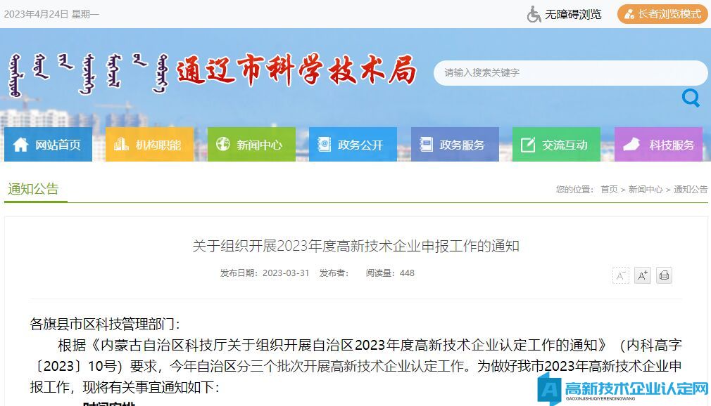[通辽市]关于组织开展2023年度高新技术企业申报工作的通知