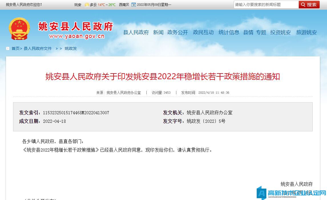 楚雄州姚安县高新技术企业奖励政策:关于印发姚安县2022年稳增长若干政策措施的通知