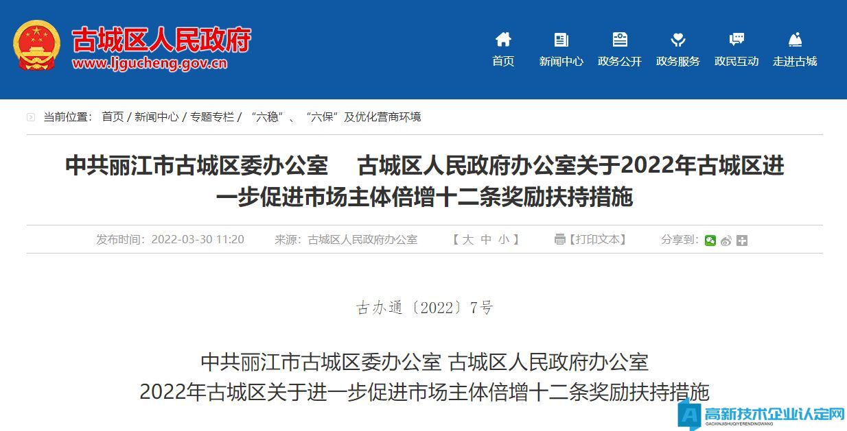 丽江市古城区高新技术企业奖励政策:关于2022年古城区进一步促进市场主体倍增十二条奖励扶持措施
