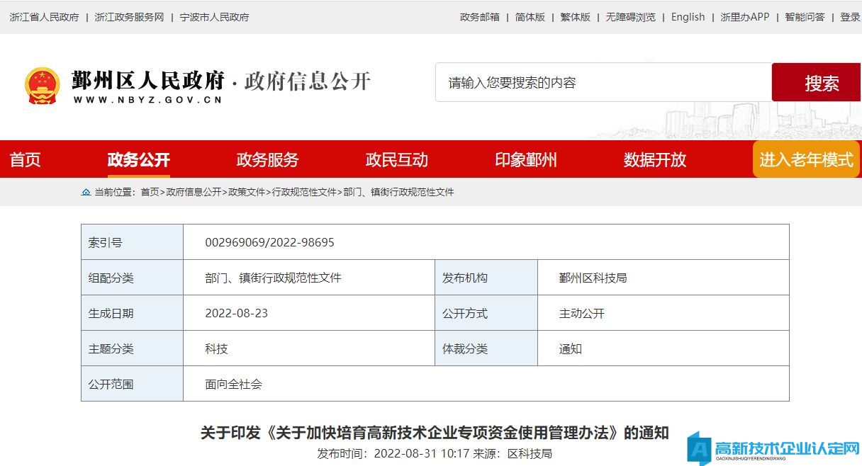 本文标题:宁波市鄞州区高新技术企业奖励政策:关于加快培育高新技术企业专项资金使用管理办法